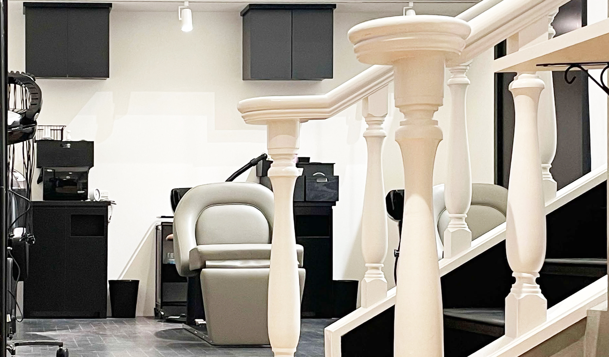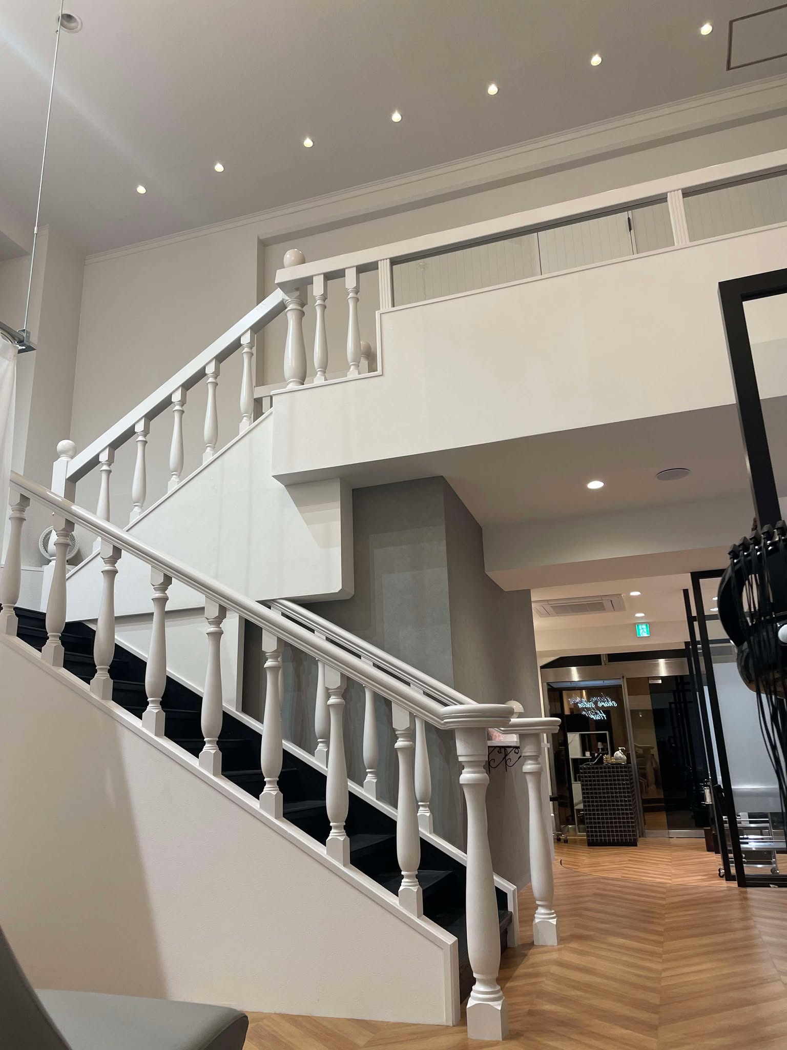 正面入って1階は美容室になっています。間仕切りのあるカット台が並び、そしてカラー用の調合スペース。奥にはシャンプースペースとヘッドスパ、エステ台があります。