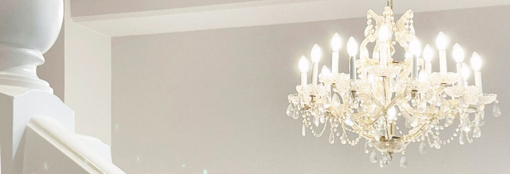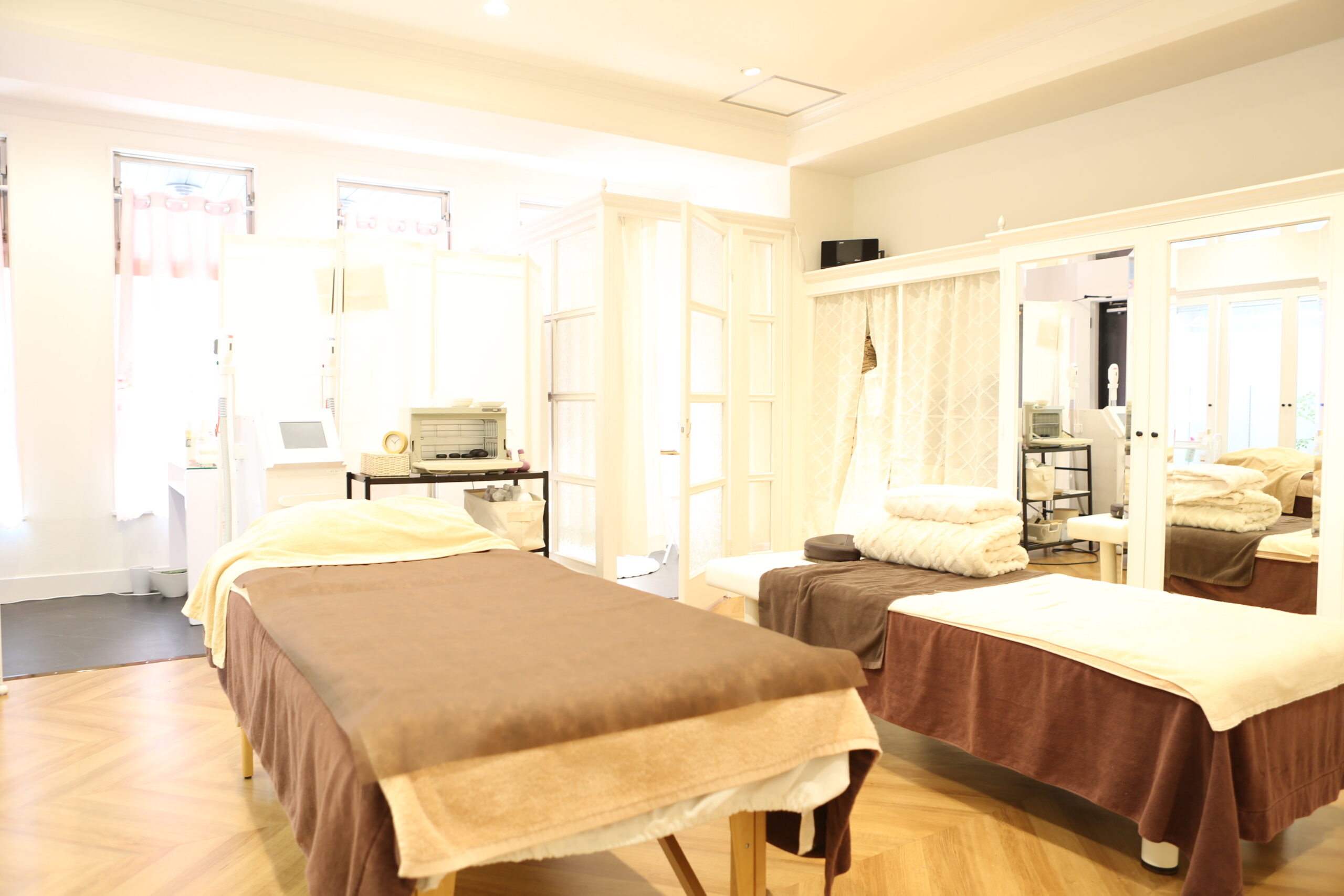 1階の奥に進むと、2階までのシャンデリアのある高い天井で洋風の豪華な階段が現れます。階段を上がった部屋がエステルームとなっています。ベッドは2台、別室で、ハンドマッサージなどに使える小部屋もご用意しています。
